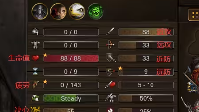 在讨论人物的数值模型之前,我们先来了解一下人物的属性点。战场兄弟的人物属性一共有八项,简称八围,分别是近攻、远攻、近防、远防、生命值、疲劳、决心、主动值。具体标注如下图: