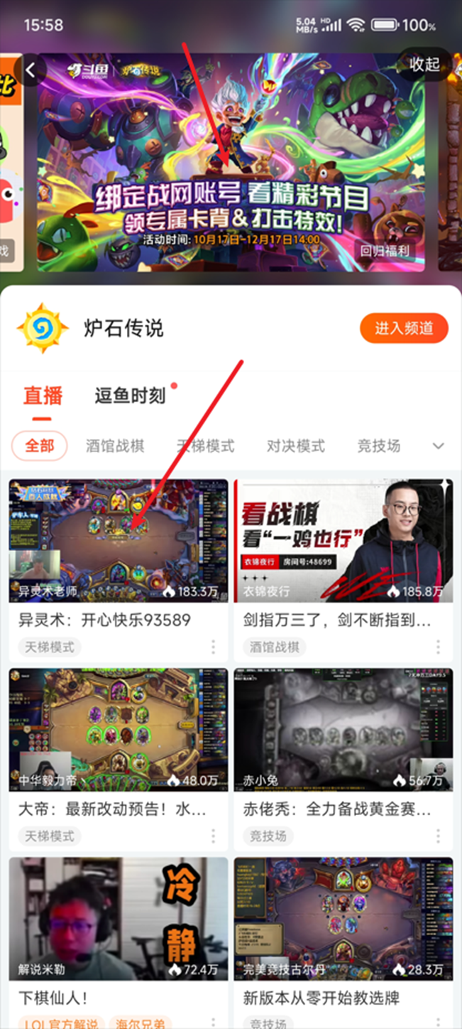 第二步:进入【炉石传说】分区,点进任意直播间,进入活动专题页;