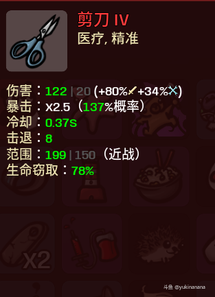 可以看到在绿字伤害122边上有一个暗的20,这个就是该武器的基础伤害,同时括号中可看到该武器伤害的影响属性,对应图标可看到,剪刀的可从近战伤害中获得的伤害值比例为80%,我这把拿到了道具钉子,所以也可从工程学中获得伤害值比例34%