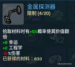 探测器概率让拾取的材料翻倍,但实际效果一般,我这把拿了4个,一共也就加了600多块。诱饵召唤的宝箱怪配合背包(拾取战利品获得15材料)可以起到不错的经济效果。另外就是