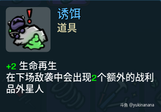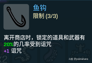 鱼钩,请大家在商店中看到这个道具一定不要错过。使用方法就是在买到鱼钩后在商店中刷新到一把自己想要用的武器,然后锁定,进入下一回合,然后祈祷打完这回合后,你锁定的武器变成诅咒武器就可以了,虽然看脸,但诅咒武器和道具的强大效果值得。所以切记,在获得鱼钩后,每回合开始前都尽可能锁定1-2个想用的武器或道具。