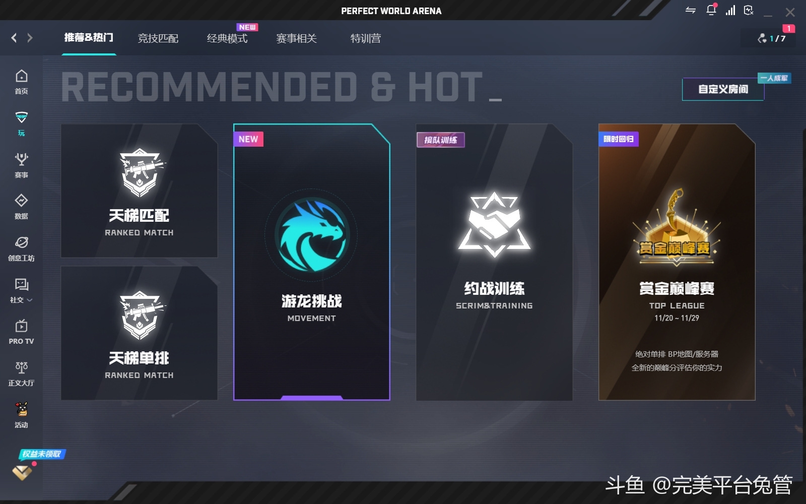 完美平台现已推出游龙挑战&游龙训练模式,包含实战常用身法点位,点位专练,以及增加区域限制墙,失误也可快速返回初始点。完成游龙挑战更可获得丰富奖励,让你不再外场“坠速传说”,从此场内游龙~