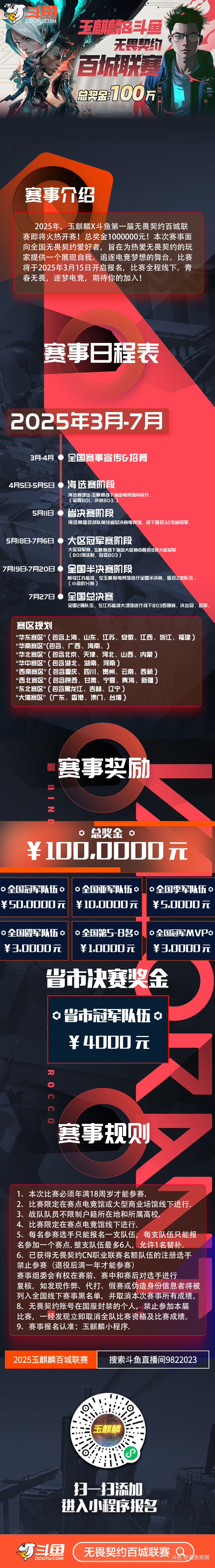斗鱼X玉麒麟联袂呈现无畏契约百城联赛 即将拉开帷幕全国200个城市参赛,对100万总奖金发起角逐更有斗鱼明星主播参战,为赛事再开惊艳一枪为理想而生,为梦想而活四月开赛,一起来瓦!