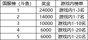3.游戏内国服榜top20且斗鱼top5进行奖励核算,国服榜斗鱼top5主播续满足游戏内榜单排名范围,如不满足要求则降档核算。例:A主播游戏内榜单第8名,斗鱼排名第1名,则对应奖金为10000元,B主播游戏内榜单第12名,斗鱼第2名,则对应奖金为6000元。