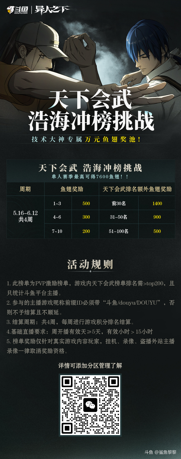 报名方式:扫下方二维码添加斗鱼异人之下分区超管