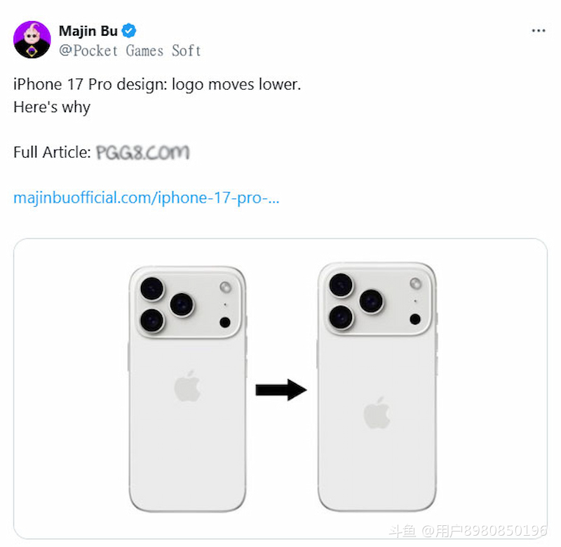 根据爆料达人Majinbu透露,苹果将为iPhone 17 Pro重新调整背盖Logo位置,由原本的中心点略微下移,推测是为了配合全新的相机模块设计。这项调整不仅提升整体视觉平衡感,也强化品牌辨识度。然而,这也是自iPhone 11以来,苹果首次动刀机背Logo布局。