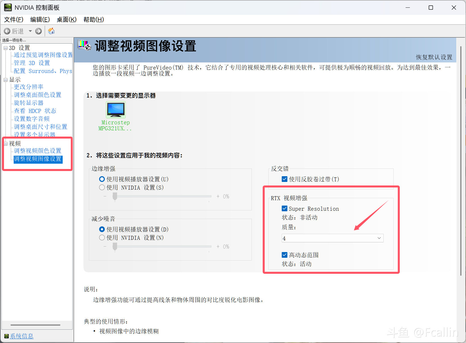 然后回到桌面上右键选择‘nvdia控制面板’找到‘调整视频图像设置’把rtx视频增强打开,一共有4档选择,当然对应的显卡要求也随等级越高而提升,等级越高效果越好显卡功耗越高,这里就看你个人的需求。