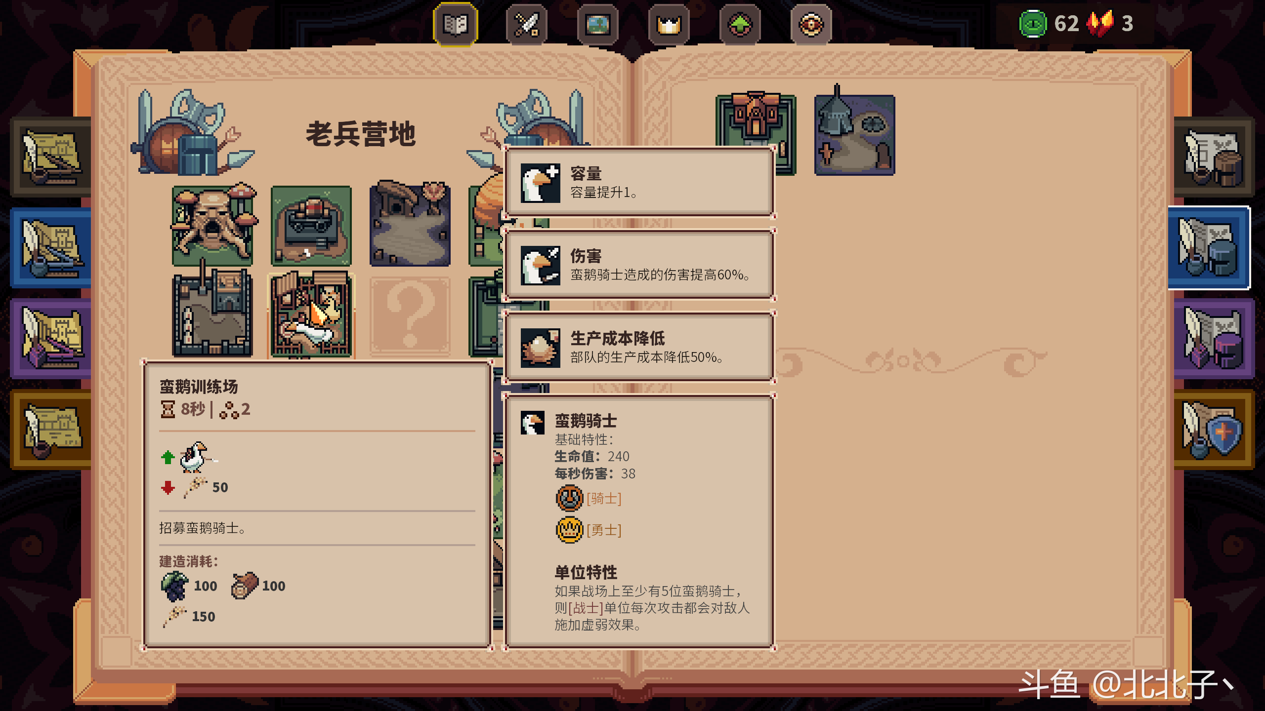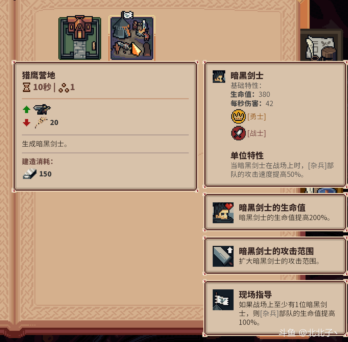 其次是局内成长,最重要的是建筑升级,有些建筑升级前后完全是两个强度,比如麦田升级后25%概率出金币,一个麦田可以同时带来一个小金矿的收益,省了一个放金矿凝视格;再比如老兵里的猎鹰营地,拿到200%生命值强化后就可以用20麦子造出一个1200血40攻击力的超强前排。