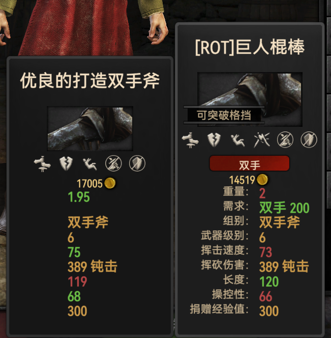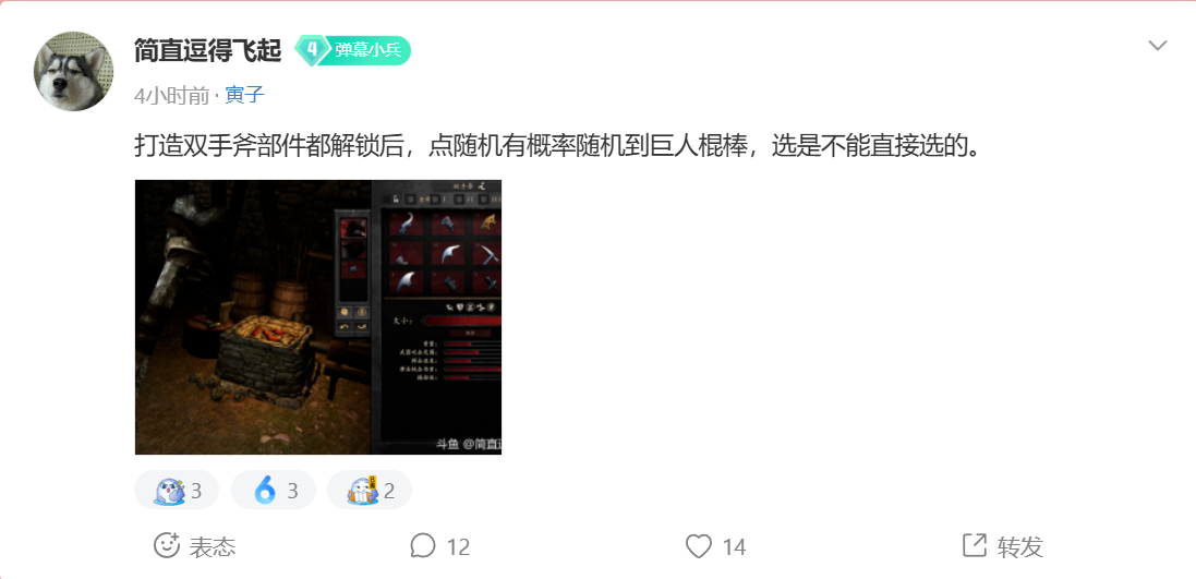 2、这位兄弟发现的新大陆,我也以为可以获得更多的大鸡腿了,我亲自上游戏测试了,确实是可以在双手斧那随机获得,但是打造出来的就是个389钝击的普通武器,是没有大鸡腿突破格挡的特效的!!!能突破格挡的只有系统的大鸡腿和夜王长战剑!