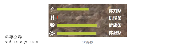 体温条:喝茶水、咖啡等饮料或站在篝火旁可以补充体温,饮料可在食品店购买或自行制作,体温值与饥饿值共同影响体力回复速度.