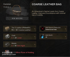 基础负重为200 在 10级、30级、45级会解锁额外的背包格,共三个 10级任务会给一个50负重的背包,也可以自己制作背包,最高一个背包增加300负重 背包制作(裁缝处) 皮革×45 布料×25 铁锭×10 符文×1 其中皮革、布料和铁锭都是T2的,需要加工台加工得到,符文可以从阵营商店购买。 负重超过上限,行动非常缓慢,也无法使用技能和躲避,可以把物品放在仓库,工作台制造的时候直接可以使用仓库中的物品 同阵营仓库互通,需要支付一些金币提取或使用其他城镇的物品。