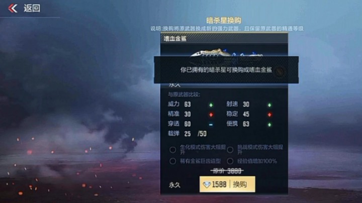 来到商城,找到暗杀星(VIP3才能购买)点击购买获得暗杀星。来到仓库,找到暗杀星,点击换购获得嗜血金鲨。 购买暗杀星换购嗜血金鲨所需钻石数量:没有折扣减价,按原价计算的话,购买暗杀星原价需要3880钻石+换购嗜血金鲨原价需要3880钻石=7760钻石。 有折扣减价的话,购买暗杀星原价需要3880钻石,商城6.1折+商城抵用券减500钻石+换购嗜血金鲨原价需要3880钻石,减价成了1588钻石=3880x0.61-500+1588=3454.8钻石