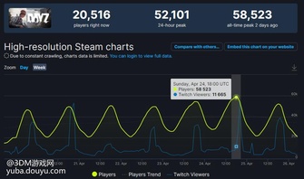 根据SteamDB的数据,《Dayz》在4月24日Steam同时在线玩家数量达到了58523名,这是自2013年12月该作进入EA阶段以来的最高值。