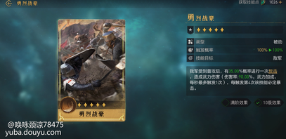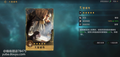 技能效果:触发谋心效果后大幅度减少我军受到的伤害,且提升主将伤害兑换要求:拥有一阶司马懿、汉尼拔,消耗8个传说信物评测:从技能属性上来看只有司马懿队伍能用的辅助技能,依靠司马懿的谋心效果,极大的增加自身队伍的坦度,29%的伤害减少是很恐怖的了,相互配合司马懿阵容的吸血,且增加主将的伤害,建议樊梨花、司马懿法枪阵容3、勇烈战豪