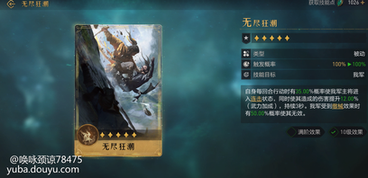 技能效果:我军受到普攻后,较高的机率进行反扑,且每第四次触发必然暴击兑换要求:拥有一阶张飞、穆桂英,消耗8个传说信物评测:s4开荒天花板张飞的专用技能,最高机率的反扑技能,不但技能本身伤害可观,对照其它反扑类技能,能让张飞固有技能触发频率大幅度提升,从而提升队伍总体的伤害能力4、无尽狂澜
