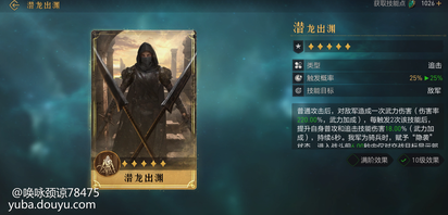 技能效果:机率让主将进入连击状态,与此同时提升伤害,且有较高的几率免疫缴械兑换要求:拥有一阶张飞、消耗司马懿、芈月或张飞信物1个+8个传说信物评测:迎击,连击体系的神技,适合吕布队伍,樊梨花队伍勉强能用,高机率进入连击状态,且有增伤属性,50%机率的免疫缴械,让输出爆发更加有保障5、潜龙出渊:
