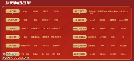 8.1-8.12日,每天19点,40余位主播组成十二支队伍雀魂麻将大乱斗,scboy,YYF,拖米等主播,谁将带领团队触及国士无双鬼神境界,让我们拭目以待~ 参赛主播详细名单: 8.1-8.4日为小组赛,12进8,分为左右两个半区,每个半区6进4 8.6-8.8日为淘汰赛,8进4,总积分前四队伍晋级决赛 8.10-8.12日为总决赛,总积分第一队伍将获得游戏内限定称号——斗鱼雀神杯冠军称号! 详细赛程如下图所示: 比赛期间,关注各参赛主播直播间,月卡,游戏CDK等你来拿 各队队长直播间:scboy [link src="3484" url="https://www.douyu.com/3484" safe="1" type="9"]网页链接[/link]老陈 [link src="74960" url="https://www.douyu.com/74960" safe="1" type="9"]网页链接[/link]安澜 [link src="533334" url="https://www.douyu.com/533334" safe="1" type="9"]网页链接[/link]yyf [link src="9999" url="https://www.douyu.com/9999" safe="1" type="9"]网页链接[/link]Ace凡森 [link src="4330332" url="https://www.douyu.com/4330332" safe="1" type="9"]网页链接[/link]DL丶拖米 [link src="793400" url="https://www.douyu.com/793400" safe="1" type="9"]网页链接[/link]大胖狗koko [link src="9168507" url="https://www.douyu.com/9168507" safe="1" type="9"]网页链接[/link]820邹倚天 [link src="507882" url="https://www.douyu.com/507882" safe="1" type="9"]网页链接[/link]大木金仙、 [link src="1870001" url="https://www.douyu.com/1870001" safe="1" type="9"]网页链接[/link]艾琳 [link src="10639765" url="https://www.douyu.com/10639765" safe="1" type="9"]网页链接[/link]林九鸽 [link src="10970886" url="https://www.douyu.com/10970886" safe="1" type="9"]网页链接[/link]令北 [link src="69190" url="https://www.douyu.com/69190" safe="1" type="9"]网页链接[/link] 淘汰赛最终积分&决赛赛程如下图所示: