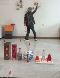 小鲁班给你的灵感仅供参考 视频有2个红色标出来角度箭脱手。 两个人点位都是固定死的 脱手线=箭角度 每个人身高不同箭的角度不一样 需要找到适合自己的脱手线角度固定死角度练习力度。在掌控力度 力度分三种 小力 中力 大力 2. 试投校准:按新角度投3次,过靶就降1-2°,够不到就加1-2°,同时保持发力不变。 传统投壶角度以下两点 ①角度角度太低的话,即便用大力,也容易投得近。 核心原因:大力只能增加总初速度,但角度不够时,水平方向的有效推进分量依然占比低,大部分力量会转化为垂直方向的力(比如扎地、过高弹起),没法有效提升远度;就像推着箱子往斜下方使劲,再用力也难让箱子往前滑远。 ②角度过高反而不会更远,还可能更近! 核心逻辑:投壶远度的关键是“水平速度分量”,角度超过45°后,力度会更多分配给垂直方向(让壶飞得更高),水平推进的力反而减少,落地时的水平距离会缩短;就像扔纸飞机,抬得太高只会往上飘,不会往前飞更远。 适配155cm身高+2.22米距离的箭尾投方案 核心调整:角度抬高+力度微调 - 最佳角度:32°-35°(比中等身高高3-5°),抵消出手点低的问题,避免贴地扎地,确保轨迹能平稳够到2.22米靶区;视线略向上抬(瞄准靶心上方5cm处); 1.55cm身高的出手点偏低特点,搭配箭尾转一圈的动作,小力、中力、大力可按不同场景适配调整,具体技巧如下: 1. 小力:适合1 - 1.5米近距离投壶。握箭用三指轻夹箭尾,旋转时手腕仅小幅度转半圈再回正,避免力量浪费。发力仅靠指尖和手腕轻推,力度像拿筷子夹菜般轻柔,投掷角度降至28° - 30°,瞄准壶心正上方2cm,防止箭因力度小下坠过快。 2. 中力:适配常用的2 - 2.22米距离。按之前适配的32° - 35°角度投掷,手腕带动箭尾完整转一圈,发力以小臂带动手腕为主,力量像提笔写中楷字般适中,比常规中力略增1/5。出手时指尖顺势轻拨箭尾,让箭带轻微后旋,提升飞行稳定性,瞄准壶心上方5cm即可。 3. 大力:适合2.5 - 3米远距离投壶。站姿调整为后脚蹬地、身体微扭转蓄势,旋转时手腕转一圈的同时,配合上臂小幅挥摆发力,力度类似挥笔写大字。投掷角度抬高到38° - 40°,抵消远距离下坠和旋转带来的力量损耗,瞄准壶心上方8 - 10cm,避免箭飞过靶区。 是不是看完了 无论你那种方式只要勤奋练成肌肉记忆就会百发百中。这也投壶大师说的。投壶是技巧➕运气。好的心情才能带来好的运气[龇牙]