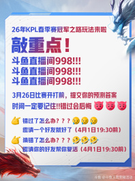 【2026斗鱼KPL春季赛冠军预测】 大家期待已久的<冠军之路>26年春季赛版本来啦!3月23日,斗鱼【KPL冠军之路】预测活动再次开启,对局全部预测正确的水友可一起瓜分10万元赛事福利金! 只要在指定时间填入你的预测晋级对阵,即可坐等大奖的到来~水友们如果错过预测截止时间、或预测失败也不用担心,在指定时间前完成任务即可获得复活机会! 来,和鱼娘一起来看看详细的玩法介绍吧~ 1.参与方式 3月26日19:00 前,所有观赛用户可根据页面引导,无门槛完成淘汰赛比赛的胜负预测;预测结果将随赛程更新,预测全对的用户即可瓜分10万赛事福利金; 用户可前往斗鱼998官方直播间或各大二路主播间下方的【冠军预测】页面进行参与,或直接在斗鱼搜索冠军预测进行参与~ 2.预测返场机制 3月26日 19:30 - 2026年4月1日 19:00 期间,未参与预测的水友可在此限时返场期间,完成指定任务参与冠军之路预测 3.复活机制 3月26日 19:30 - 2026年4月1日 19:00 期间,若预测结果存在预测错误的场次,可完成指定任务进行复活,复活后可修改预测答案并再次提交,复活后提交的答案若最终全对仍可参与瓜分(此阶段内不限制复活次数) 4.奖金瓜分 预测全对的所有用户,均可瓜分10万赛事福利金奖励 快来和鱼娘一起预测书写你心中本次挑杯的晋级剧本吧!或许你就是最终的天选之子哦! #[topic src="239921"]#KPL春季赛冠军预测[/topic]